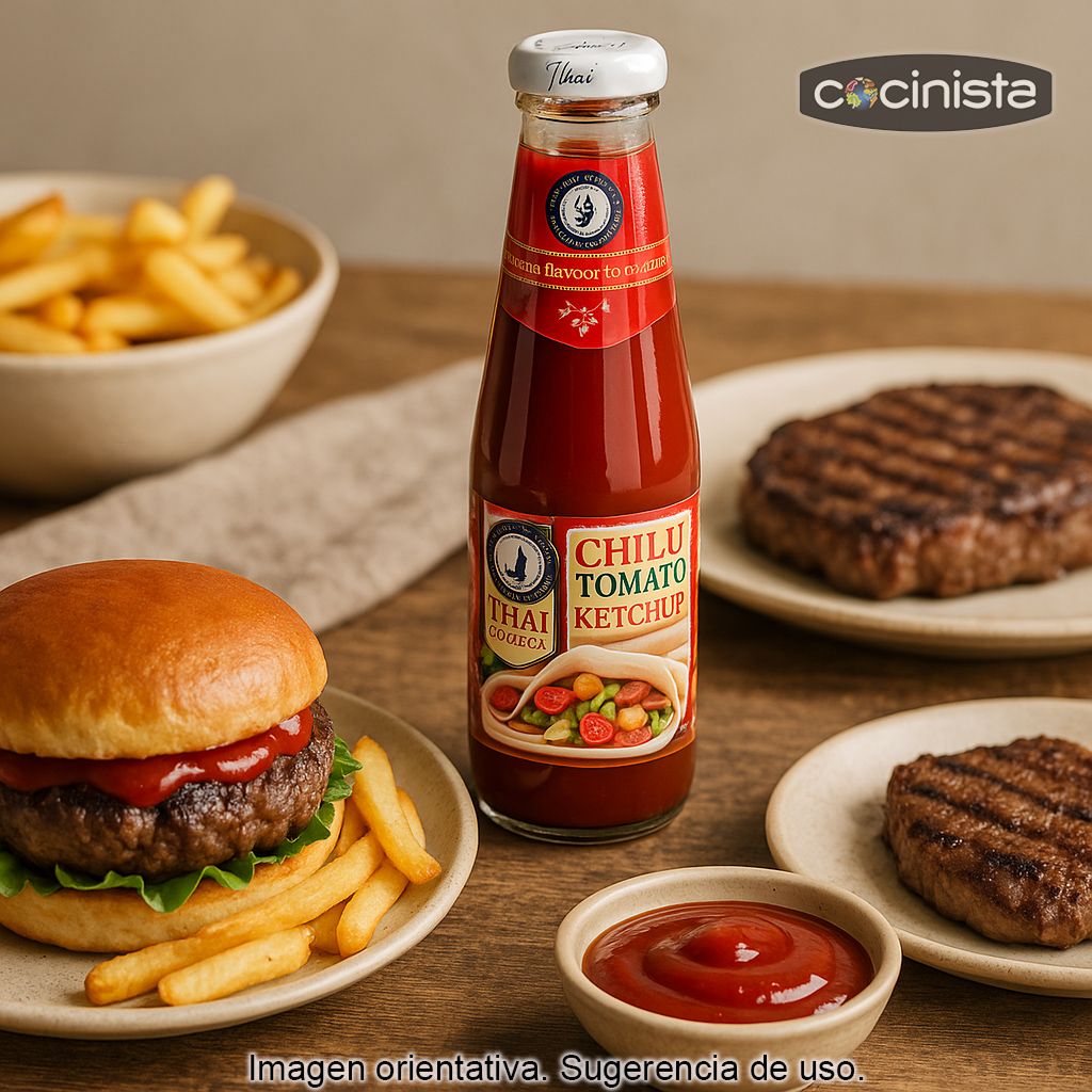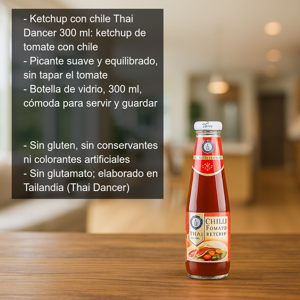 Disfruta de un toque exótico y ligeramente picante con el ketchup con chile Thai Dancer (300 ml), una salsa de tomate estilo ketchup enriquecida con chile para aportar un picante suave y muy equilibrado. Ideal si buscas salir del ketchup tradicional sin renunciar a su sabor dulce y familiar, pero con un punto extra que realza cualquier plato.