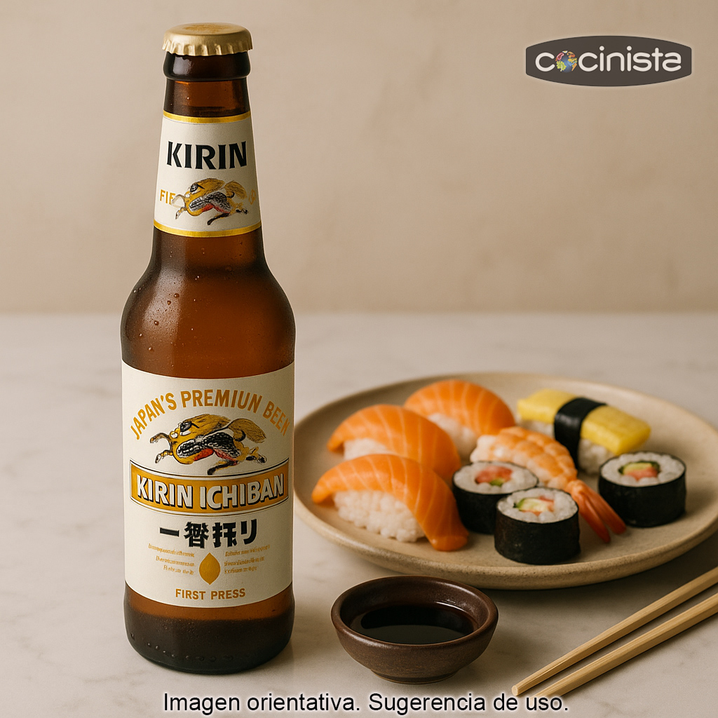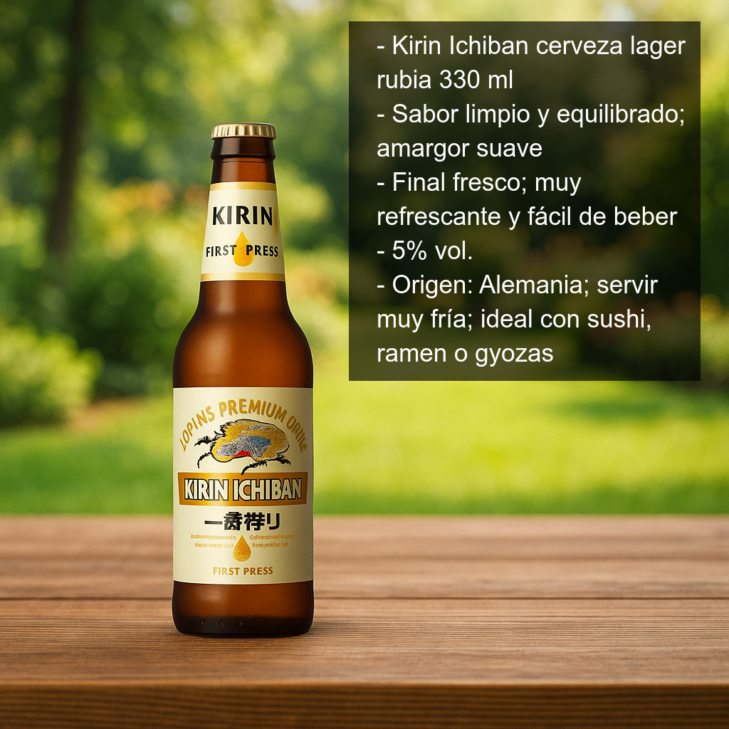La cerveza Kirin Ichiban es una de las cervezas japonesas más conocidas a nivel internacional. Se trata de una lager rubia de sabor limpio y equilibrado, con un amargor suave y un final fresco, ideal para quienes buscan una cerveza muy refrescante y fácil de beber.