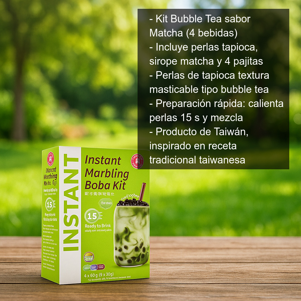 Disfruta en casa del auténtico Bubble Tea Matcha (té de burbujas) con este kit completo para preparar 4 bebidas de forma rápida, cómoda y con un resultado delicioso. Inspirado en la receta tradicional taiwanesa, combina el sabor característico del té matcha con la textura irresistible de las perlas de tapioca, creando una bebida cremosa, refrescante y llena de matices.