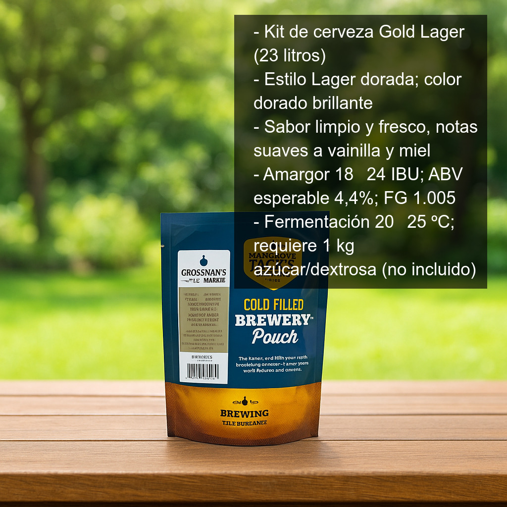 El Kit de cerveza Gold Lager (23 litros) es una excelente opción para iniciarte o seguir perfeccionando la elaboración de cerveza casera en casa. Con este kit podrás producir una cerveza tipo Lager de espectacular color dorado, con espuma cremosa y persistente y un perfil de sabor limpio, fresco y equilibrado, con ligeros toques a vainilla y a miel. Es una receta muy agradecida, ideal para quienes buscan una cerveza fácil de beber, suave y refrescante.