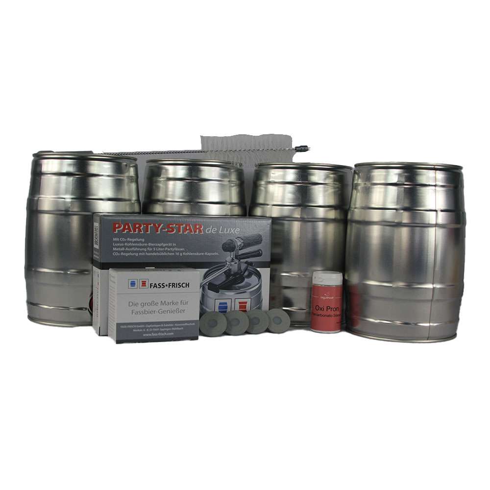 Kit de 4 barriles metálicos, cada uno con una capacidad de 5 litros pensados para que puedas envasar tu cerveza.