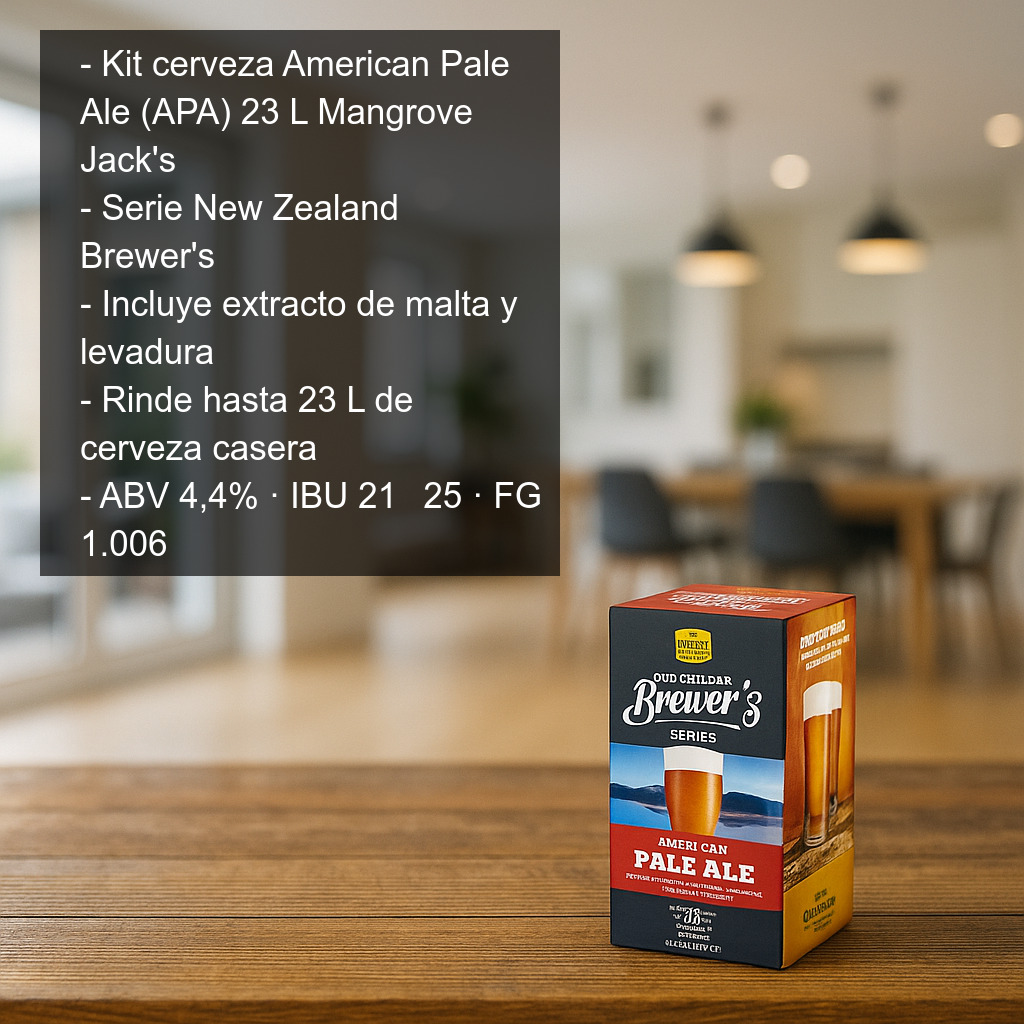 El kit de cerveza American Pale Ale (APA) 23 L de Mangrove Jack's, perteneciente a su serie especial New Zealand Brewer's, es una excelente opción para quienes quieren elaborar en casa una cerveza artesanal estilo americano con un perfil equilibrado, fácil de beber y con el carácter clásico de una Pale Ale.