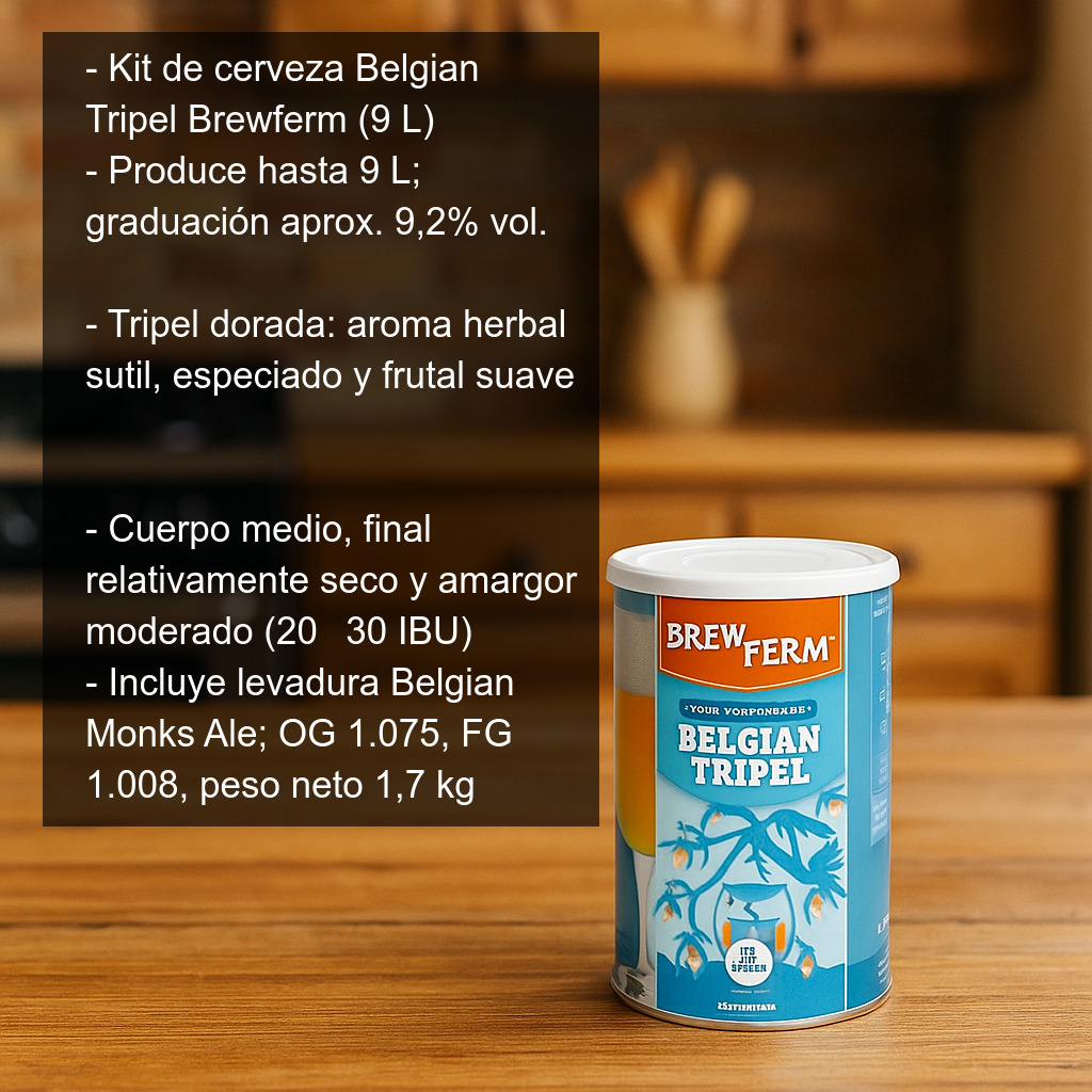 El Kit de cerveza Belgian Tripel (9 L) de Brewferm (antes conocido como Grand Cru) está pensado para quienes quieren elaborar en casa una auténtica cerveza belga de abadía: una Tripel de color dorado, con aroma herbal sutil y un perfil de malta ligeramente afrutado. Un estilo clásico, elegante y con una graduación elevada, ideal para disfrutar con calma y también para guardar y dejar evolucionar en botella.