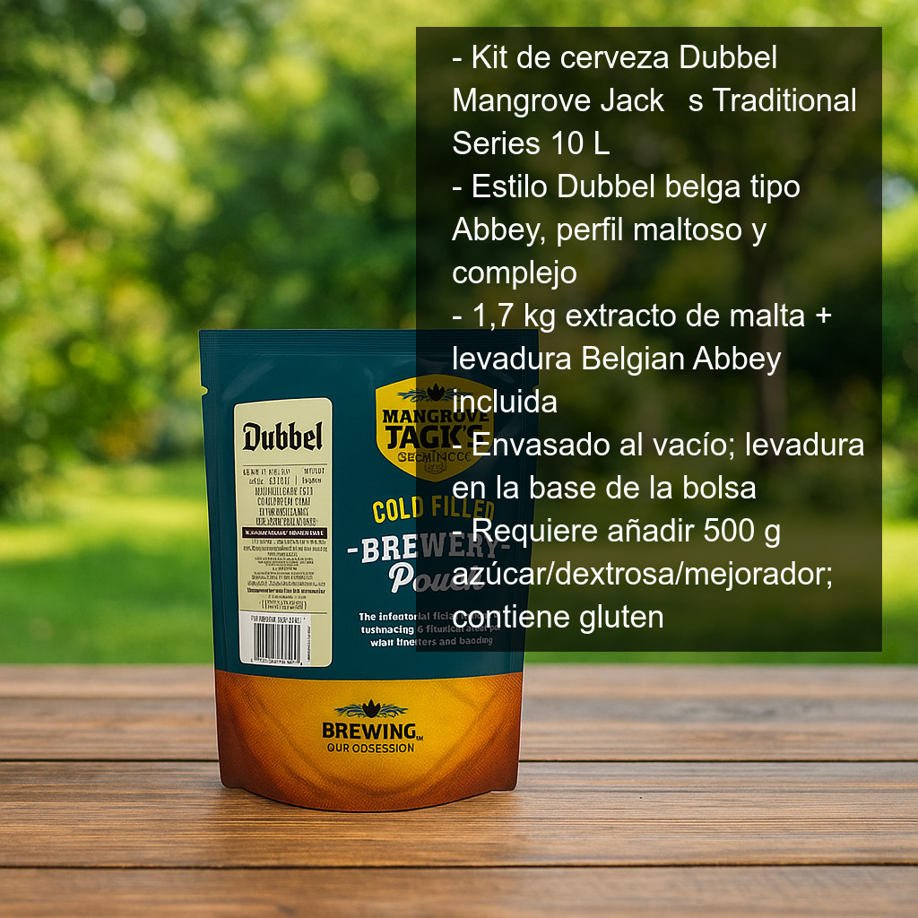 El Kit de cerveza Dubbel (Traditional Series) - 10 L de Mangrove Jack’s es una excelente opción para elaborar en casa una cerveza Dubbel de inspiración belga, con un perfil claramente maltoso, notas dulces equilibradas y un final seco que la hace muy bebible. Ideal si buscas una cerveza con carácter, cuerpo medio y complejidad aromática típica de las cervezas de abadía.