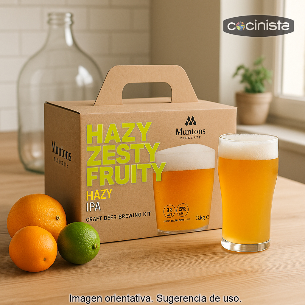 La Hazy IPA se caracteriza por su aspecto ligeramente velado y por sus aromas intensos a fruta tropical, piel de cítrico y notas jugosas típicas de los lúpulos actuales. Este kit está pensado para conseguir precisamente ese resultado: una cerveza expresiva, aromática y con una sensación en boca suave.