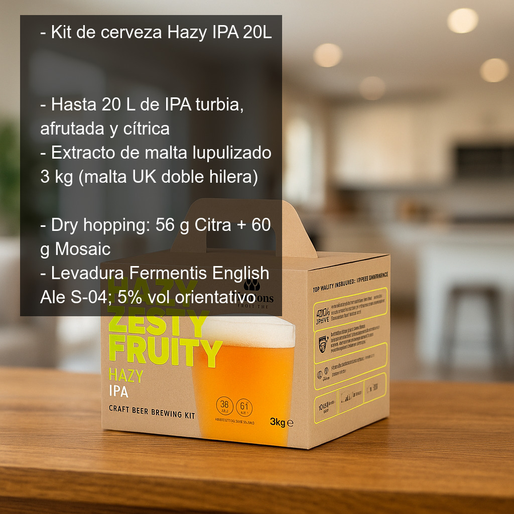 El Kit de cerveza Hazy IPA 20L es un kit premium para elaborar en casa una IPA turbia (Hazy IPA) de inspiración americana, con un perfil moderno, muy aromático y fácil de disfrutar. Con este kit podrás producir hasta 20 litros de cerveza casera con un carácter claramente afrutado y cítrico, una turbidez natural y un amargor equilibrado.