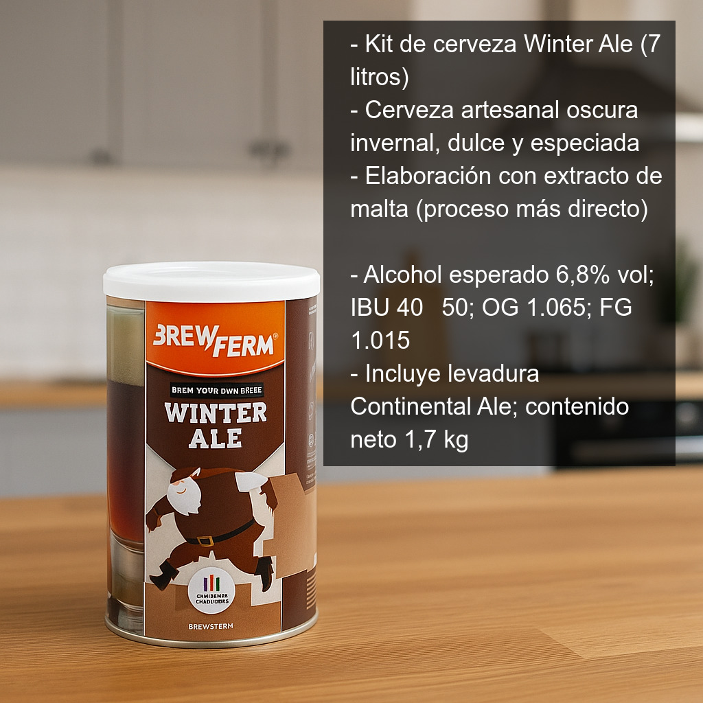 El Kit de cerveza Winter Ale (7 litros) es ideal para elaborar en casa una cerveza artesanal oscura de estilo invernal, tradicional de la época de Navidad, pero perfecta para disfrutar durante todo el año. Se caracteriza por un perfil intenso, dulce y especiado, con cuerpo y calidez, que la hace muy agradable tanto para acompañar comidas como para tomarla tranquilamente como cerveza de postre.