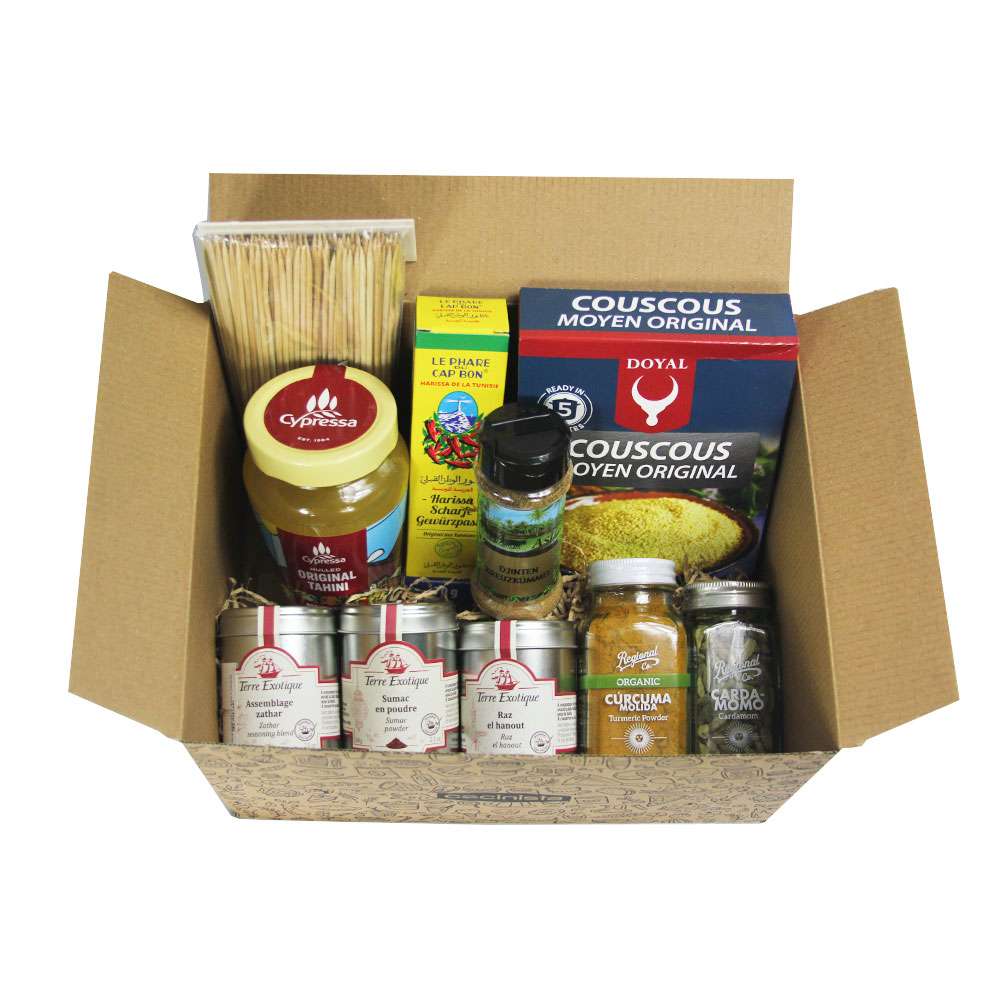 Descubre los aromas, sabores y colores de la cocina árabe con este kit de iniciación, diseñado para que empieces a preparar en casa auténticas recetas del Magreb y Oriente Medio.