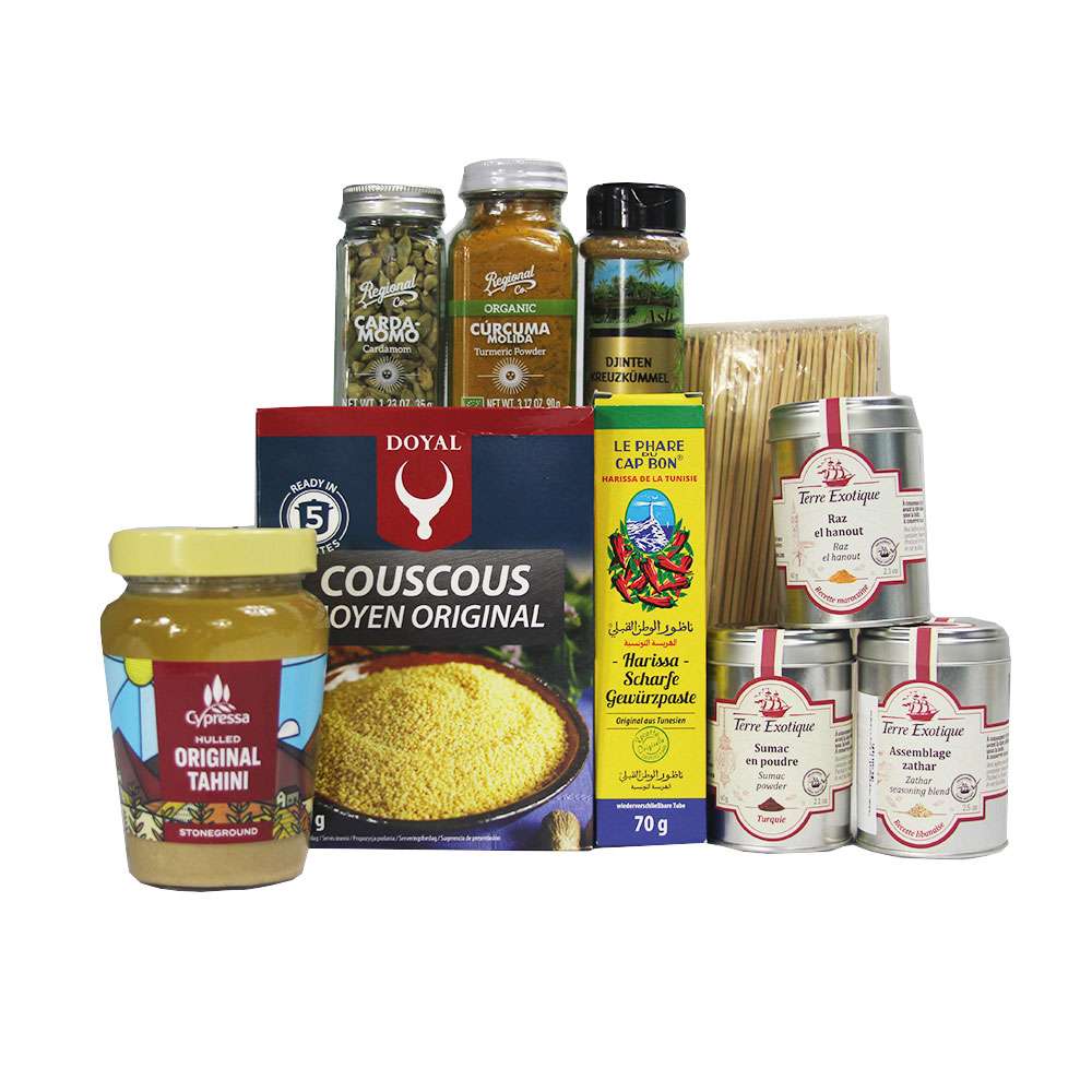 Con este kit tendrás todo lo necesario para adentrarte en la cocina árabe y elaborar desde un aromático cuscús hasta unas brochetas especiadas, pasando por cremosos hummus o guisos llenos de carácter.