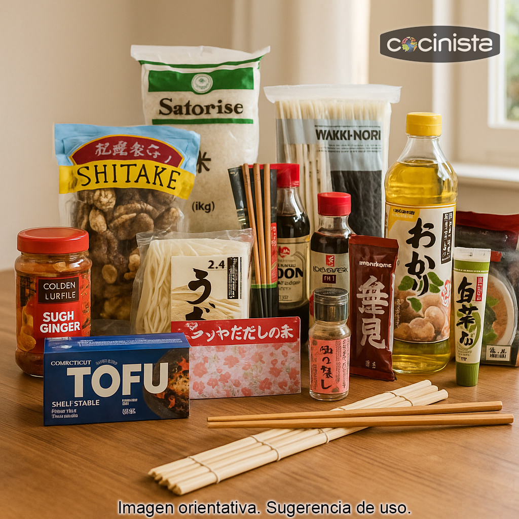 Con este pack podrás elaborar desde sushi casero (maki, nigiri, uramaki) hasta sopa de miso, caldos tipo dashi, platos con tofu y recetas con udon y soba. Una forma práctica de descubrir sabores tradicionales y modernos en una sola compra.