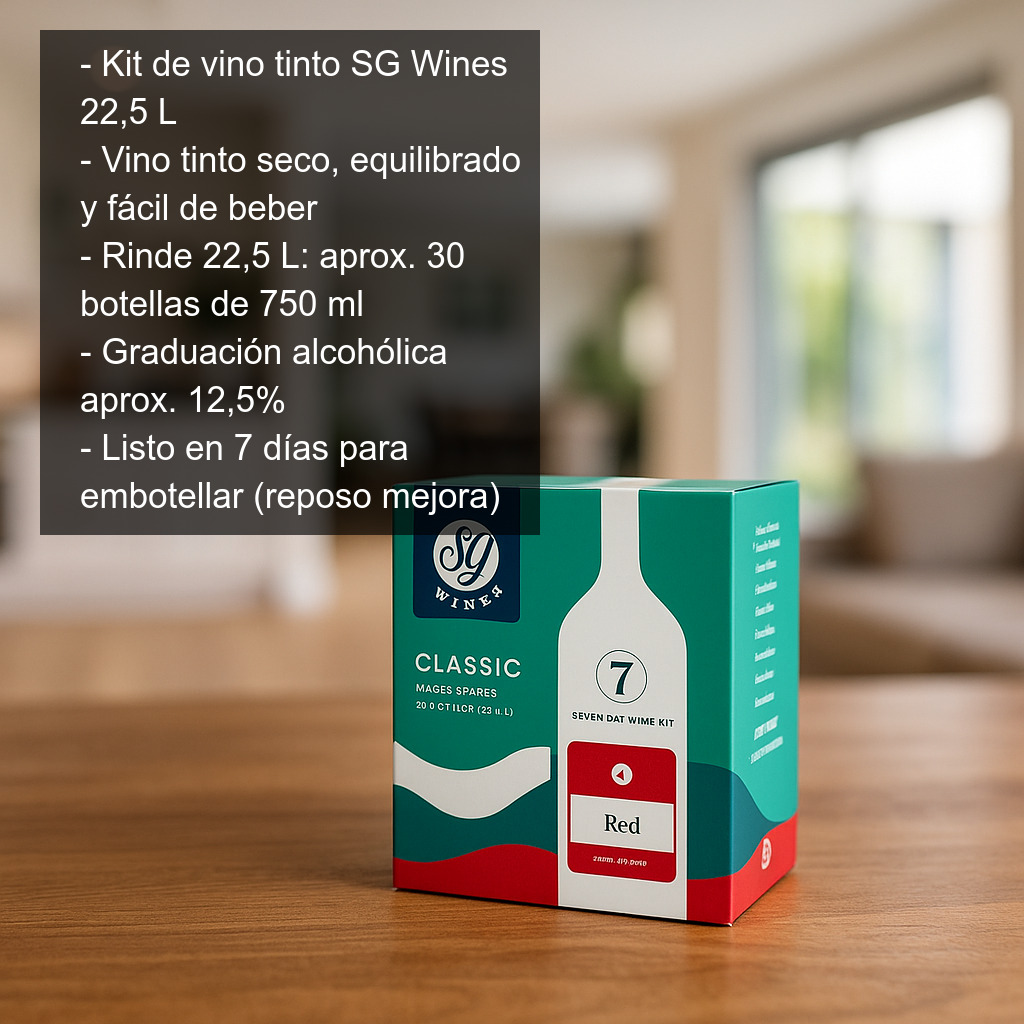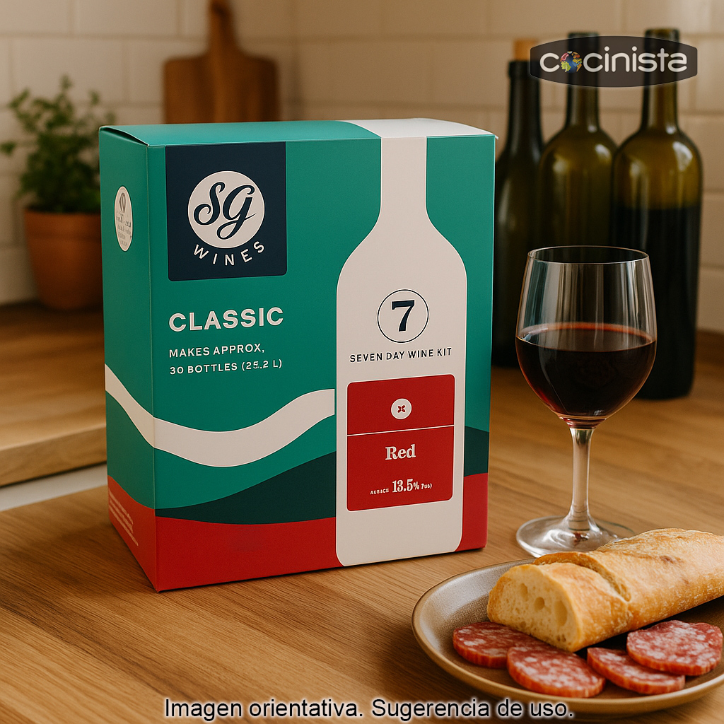 El Kit de vino tinto SG Wines (22,5 litros) es una forma cómoda y fiable de elaborar en casa un vino tinto seco, equilibrado y fácil de beber, sin necesidad de experiencia previa. Con este kit de ingredientes para hacer vino podrás obtener aproximadamente 30 botellas de 750 ml (22,5 L) con un grado alcohólico aproximado del 12,5%, ideal para disfrutar a diario o para compartir.