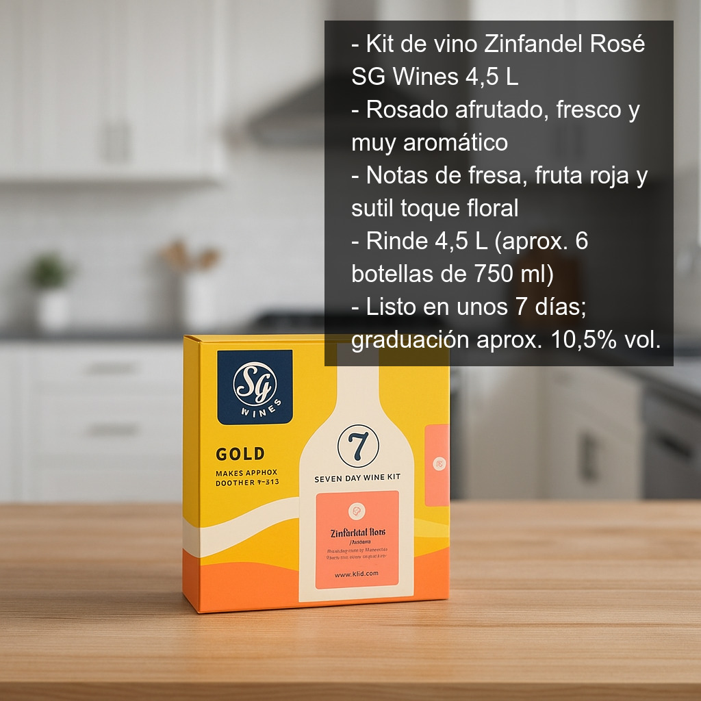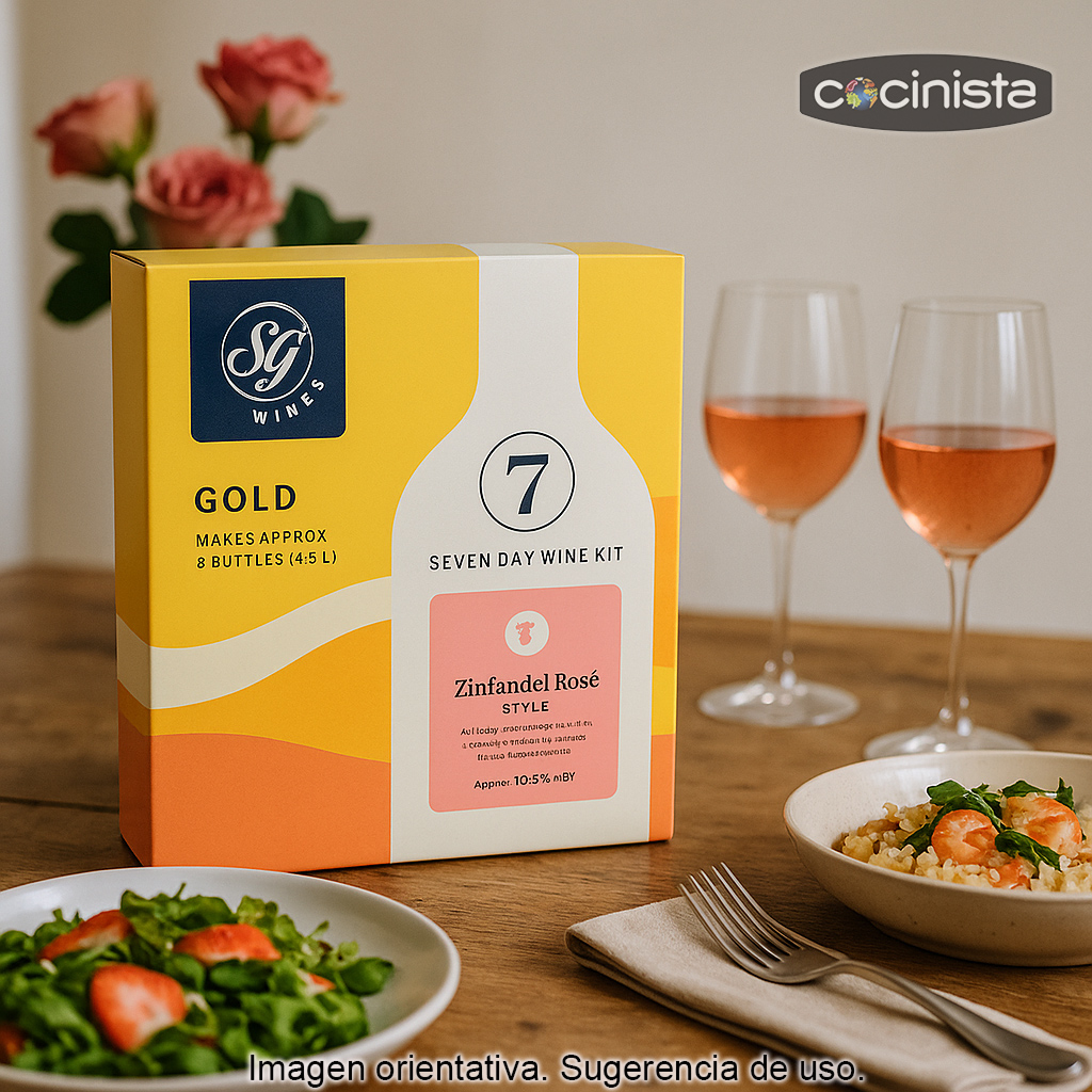 El Kit de vino Zinfandel Rosé (4,5 L) de SG Wines es una forma sencilla y divertida de elaborar en casa un vino rosado afrutado, fresco y muy aromático. Ideal para iniciarse en la elaboración de vino casero o para quienes buscan un resultado fiable sin complicaciones.