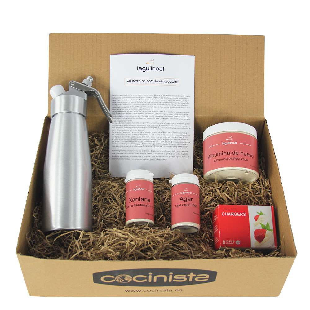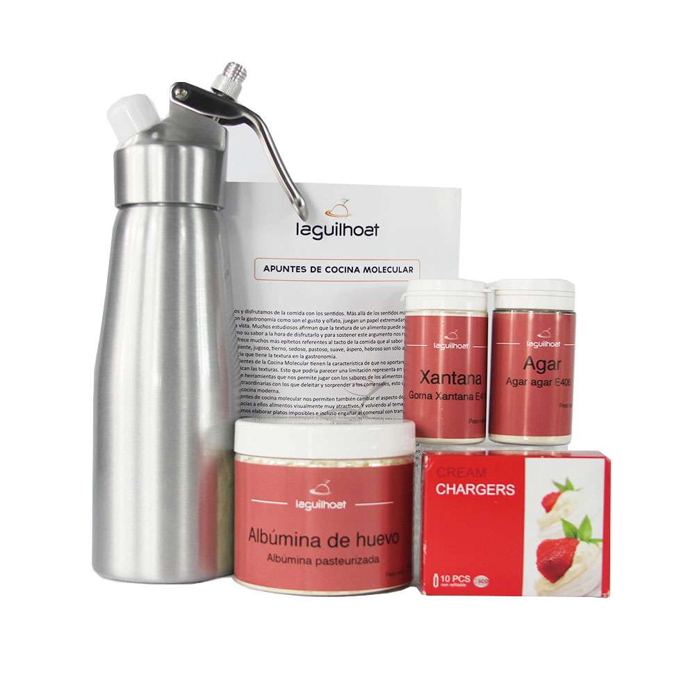 Además de un sifón de espumas, incluye aditivos naturales que no aportan sabor ni aroma pero que tienen la virtud de cambiar la apariencia y textura de los alimentos. Se trata de emulsionantes y estabilizantes que permiten obtener espumas muy ligeras y estables a partir de una gran variedad de soluciones.