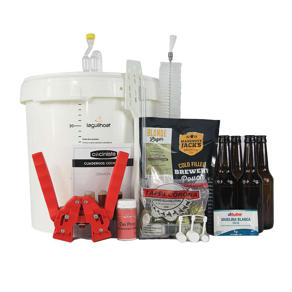 Kit de iniciación estándar, con utensilios necesarios para la elaboración de cerveza, partiendo de extracto de malta húmedo lupulizado y que incluye un sobre de levadura. El kit se compone a demás del kit estándar, de un extracto de malta a elegir entre cualquiera de estas maltas y de un conjunto de 50 botellas de 33cl en color ámbar.