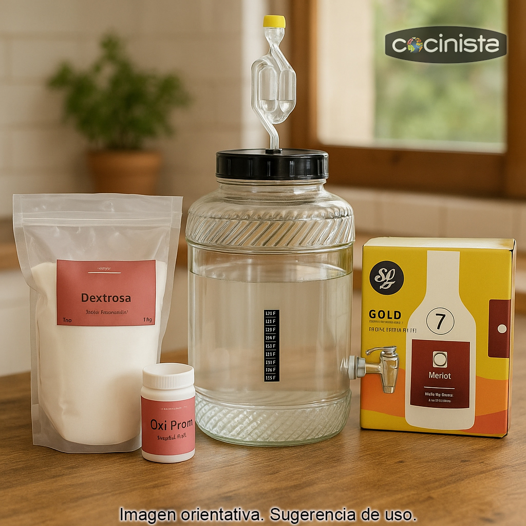 Descubre lo gratificante que es elaborar tu propio vino en casa con este completo kit mini para hacer vino tinto Merlot (5 L), pensado para quienes quieren dar sus primeros pasos en la vinificación doméstica de forma sencilla, segura y con resultados excelentes. Con él podrás preparar un vino tinto de estilo Merlot, conocido por su perfil afrutado, redondo y equilibrado, ideal para disfrutar a diario o compartir en una ocasión especial.