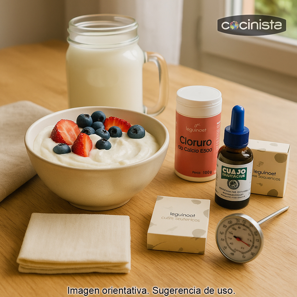 - Cloruro de calcio líquido – 100 cc (ayuda a mejorar la coagulación, especialmente en leches pasteurizadas).