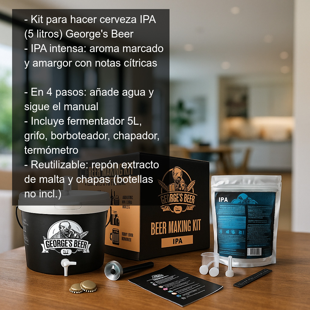 Con el Kit para hacer cerveza IPA (5 litros) George's Beer podrás iniciarte en la elaboración de cerveza artesana en casa de forma sencilla, limpia y con un resultado de gran calidad. En solo 4 pasos prepararás una cerveza IPA con personalidad: sabor intenso, aroma marcado y un amargor característico gracias a la presencia de una alta proporción de lúpulo, que aporta además notas cítricas y frescas.