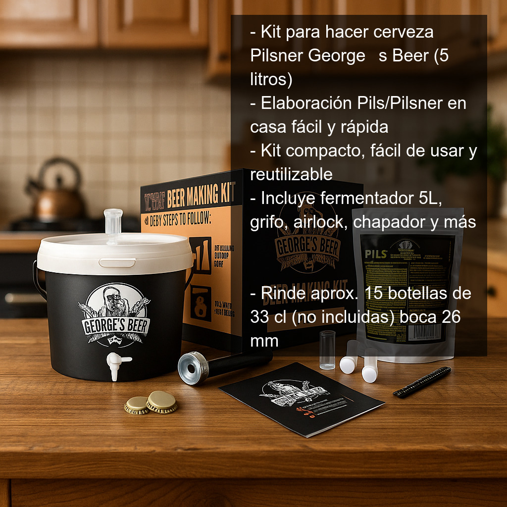 Con el Kit para hacer cerveza Pilsner George’s Beer (5 litros) podrás iniciarte en la elaboración de cerveza artesana tipo Pils / Pilsner en casa de forma sencilla, rápida y con un resultado de gran calidad. Es una solución compacta, fácil de usar y reutilizable, ideal tanto para principiantes como para quienes quieren un equipo básico para repetir elaboraciones.