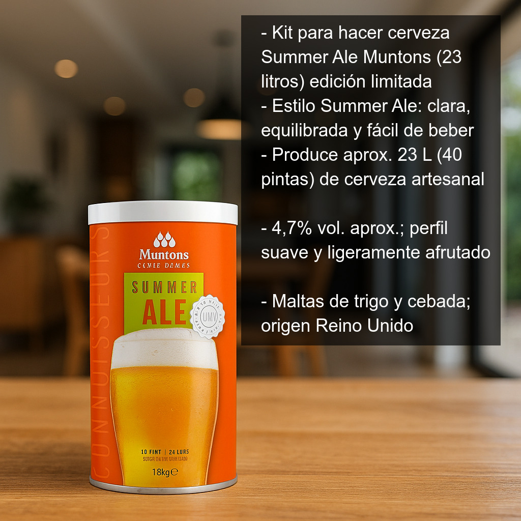 Disfruta en casa de una cerveza artesanal refrescante con el Kit para hacer cerveza Summer Ale (23 litros), una edición limitada de Muntons pensada para quienes buscan una ale clara, equilibrada y fácil de beber. Según la tradición cervecera, las Summer Ales suelen ser más pálidas y ligeras que las de invierno, ideales para acompañar los días de calor, barbacoas y reuniones con amigos.