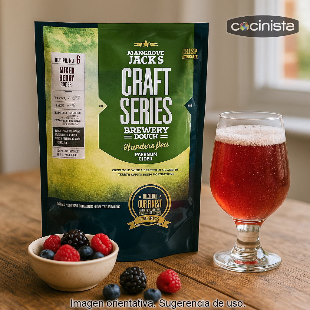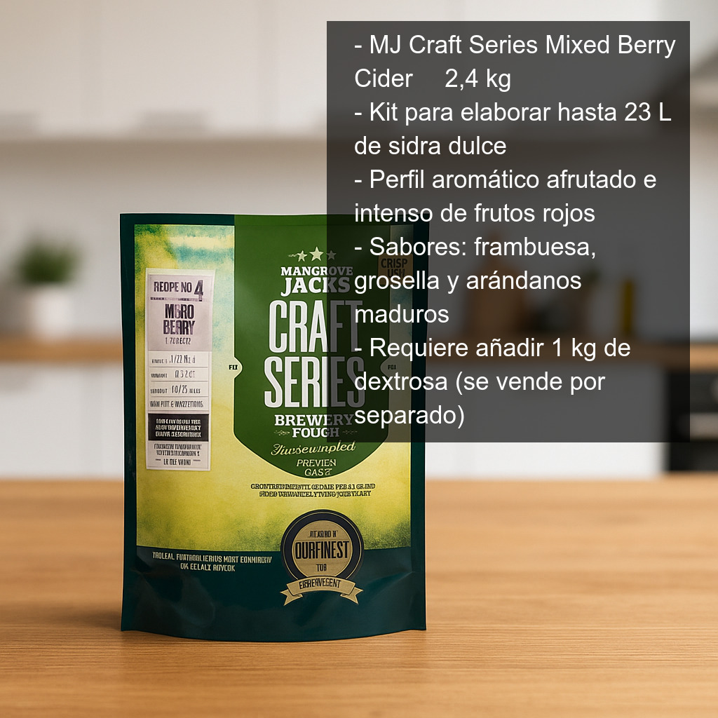 Disfruta de una sidra artesanal de frutos rojos con carácter y frescura. Este kit de sidra Mixed Berry Cider de la serie MJ Craft está formulado para elaborar hasta 23 litros de sidra dulce con un perfil aromático afrutado y envolvente.