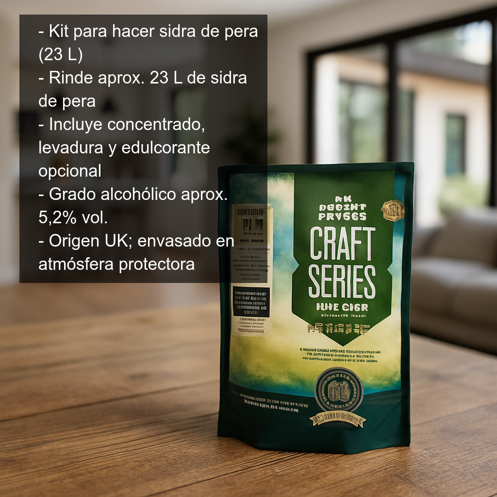 El kit para hacer sidra de pera (23 L) es un conjunto completo de ingredientes y levaduras pensado para que puedas elaborar en casa una sidra de pera aromática, equilibrada y de aspecto muy atractivo. Con este preparado obtendrás aproximadamente 23 litros de sidra con un bonito color dorado claro, ideal para disfrutar bien fría o para embotellar y dejar madurar unas semanas.