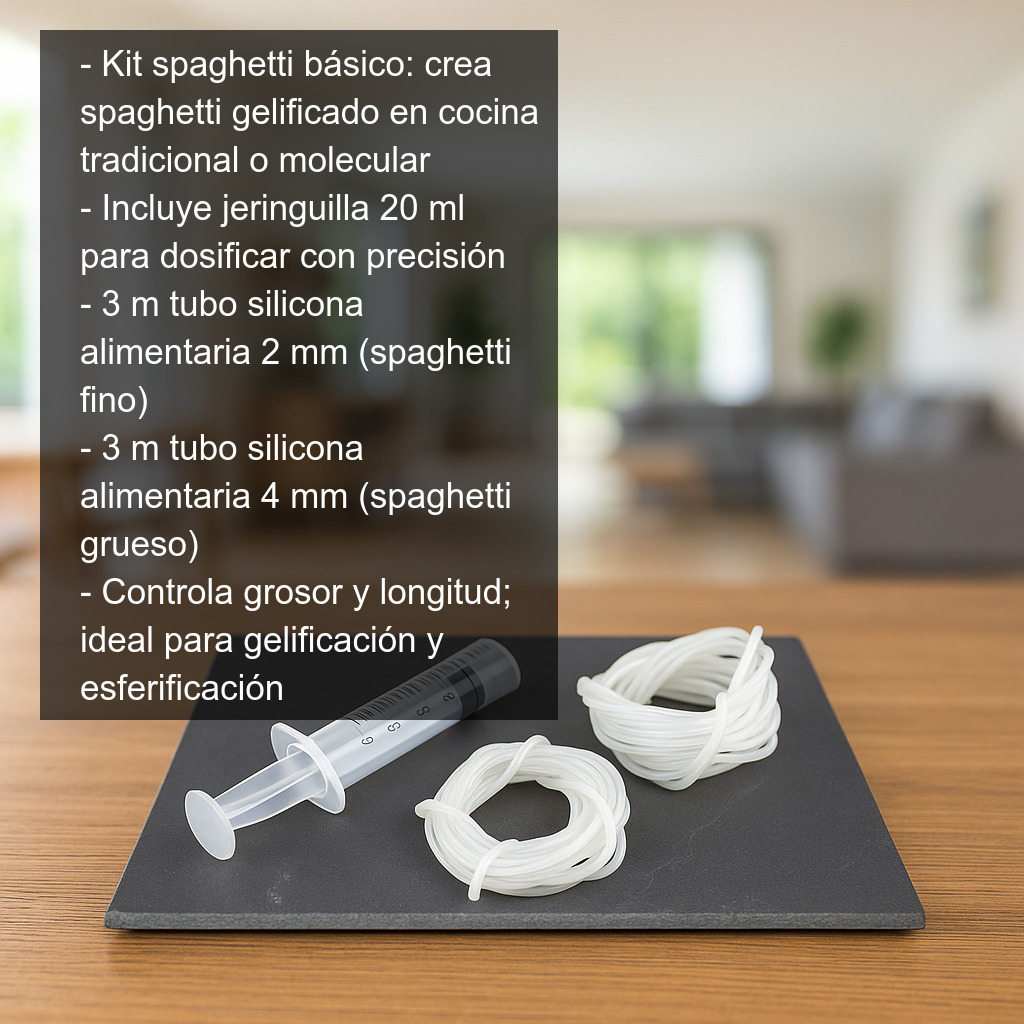 Con el Kit spaghetti básico podrás elaborar fácilmente spaghetti (espaguetis/spaguetis) tanto en cocina tradicional como en cocina molecular, creando hilos y fideos gelificados con agar-agar u otros gelificantes. Es un set ideal para iniciarte en técnicas de esferificación y gelificación aplicadas a salsas, purés, caldos o zumos, y conseguir presentaciones creativas en platos dulces y salados.