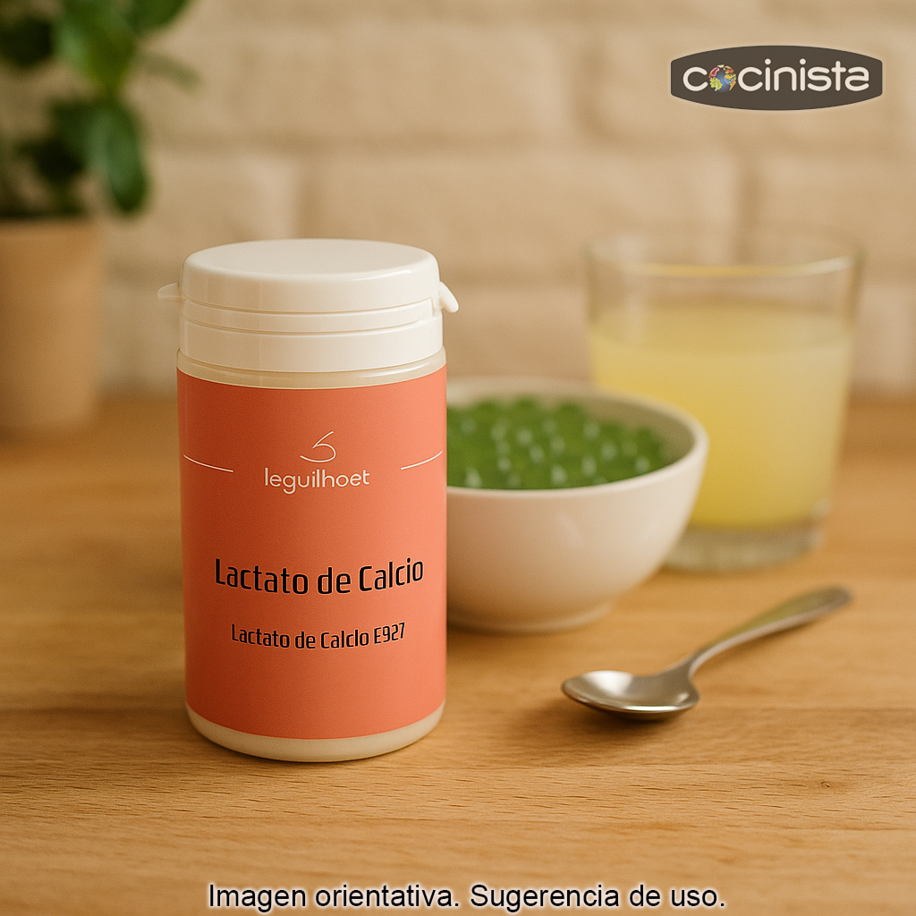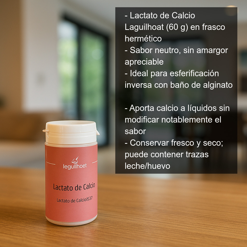 El Lactato de Calcio es un aditivo alimentario muy utilizado en cocina moderna y gastronomía molecular para aportar calcio a preparaciones líquidas sin modificar de forma notable su sabor. A diferencia del cloruro cálcico, el lactato de calcio no aporta amargor, por lo que resulta especialmente adecuado cuando se busca un resultado limpio y agradable al paladar.