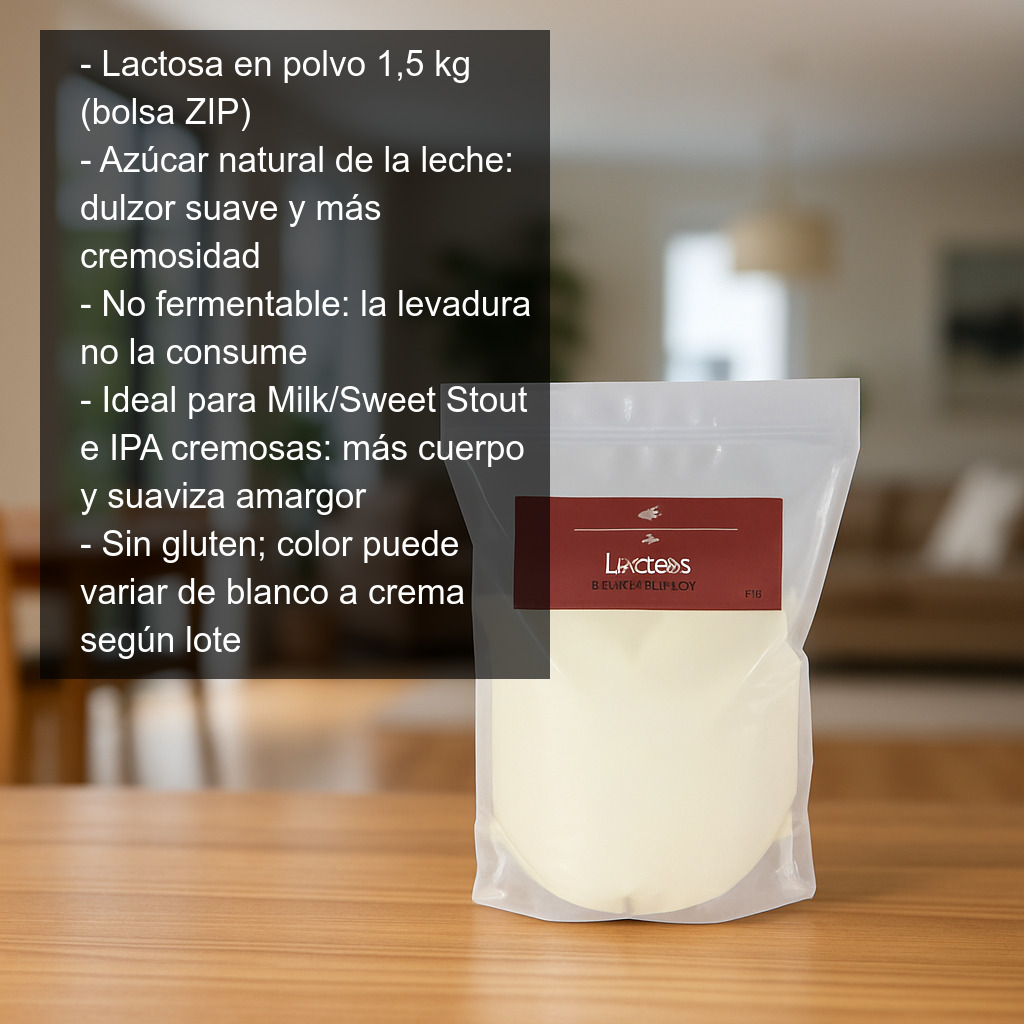 La lactosa es un azúcar natural presente en la leche, muy utilizada en alimentación y especialmente en elaboraciones artesanas por su capacidad para aportar dulzor suave, cuerpo y una sensación más cremosa en boca. Al tratarse de un azúcar no fermentable (la levadura no la consume), es ideal cuando se busca endulzar sin aumentar la graduación alcohólica ni provocar una fermentación adicional.