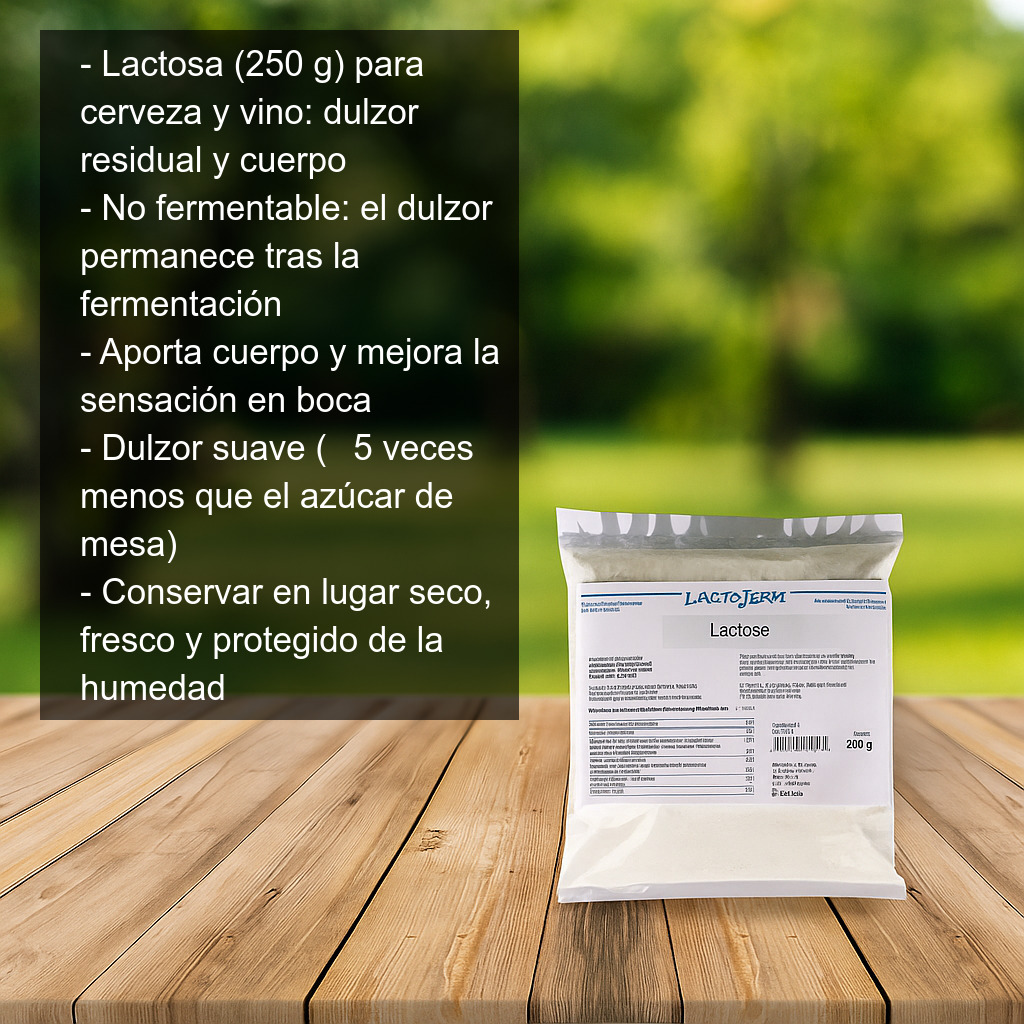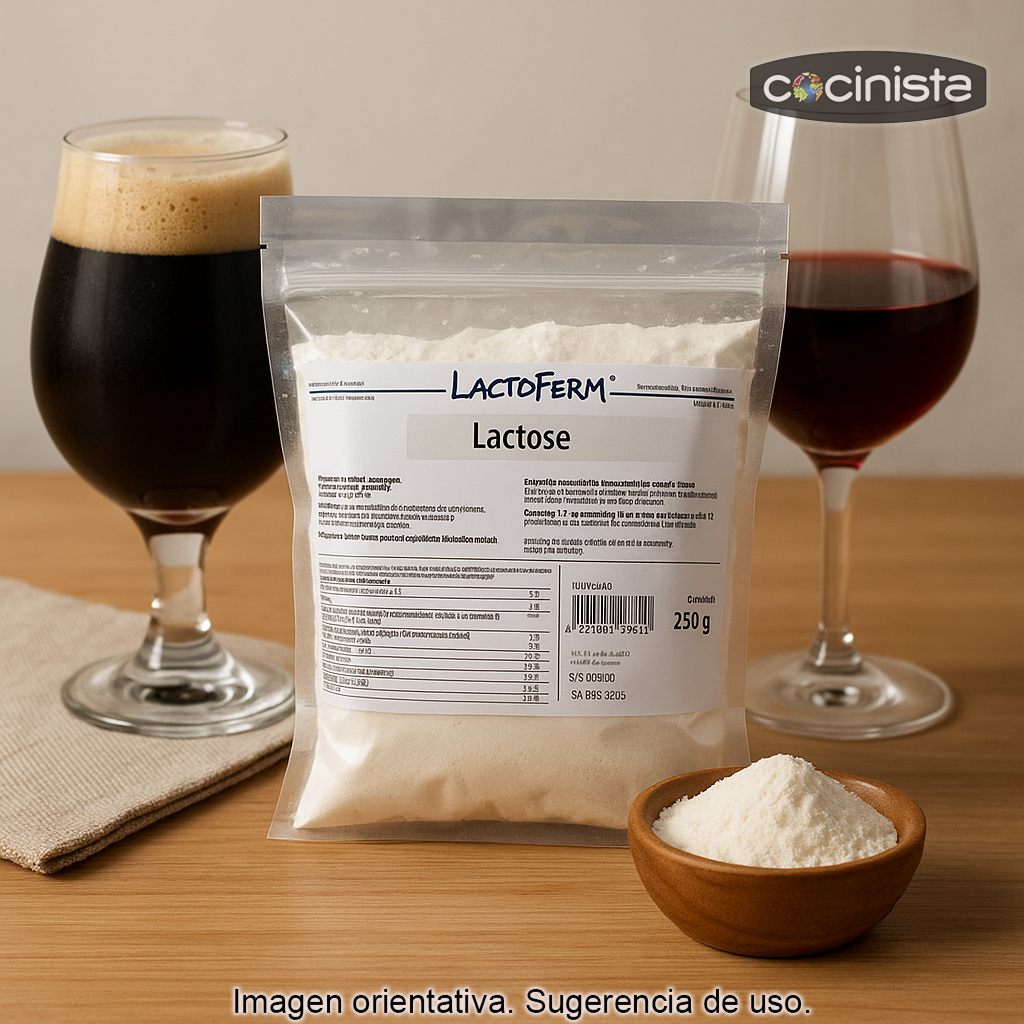 La lactosa es un azúcar no fermentable (disacárido) muy utilizado en elaboración de cerveza artesanal y en vinificación para aportar dulzor residual y una sensación de cuerpo más redonda. Al no ser consumida por la levadura durante la fermentación, el dulzor permanece en el producto final, ayudando a equilibrar amargor, acidez o notas tostadas.