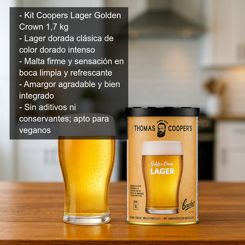 El kit de extracto de malta Coopers Lager Golden Crown (1,7 kg) rinde homenaje a una receta histórica: en 1968, Coopers elaboró por primera vez su cerveza dorada bajo el nombre de “Golden Crown”. Se trataba de una cerveza delicada y equilibrada, menos dulce que el estilo Dortmunder, que fue un éxito inmediato y marcó el inicio de una nueva etapa para la cervecera.