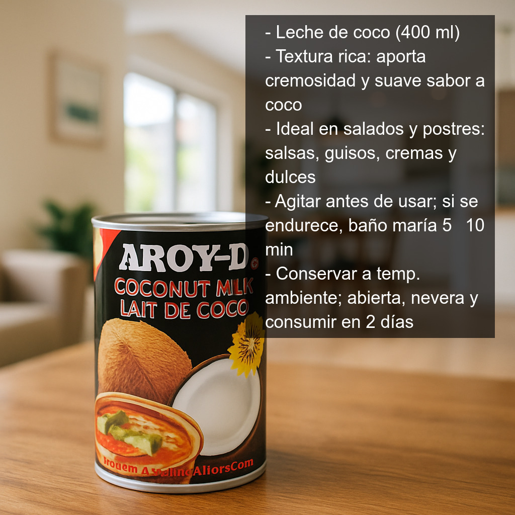 La leche de coco (400 ml) es un ingrediente imprescindible en la despensa para dar cremosidad y un suave sabor a coco a una gran variedad de recetas. Su textura rica la convierte en una opción ideal tanto para platos salados como para postres, aportando cuerpo a salsas, guisos y cremas, y un acabado sedoso en elaboraciones dulces.