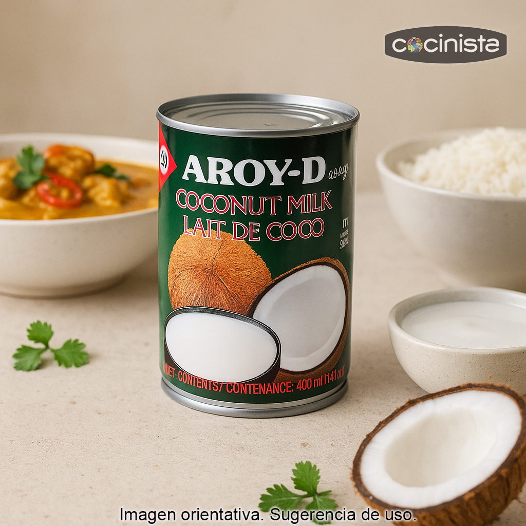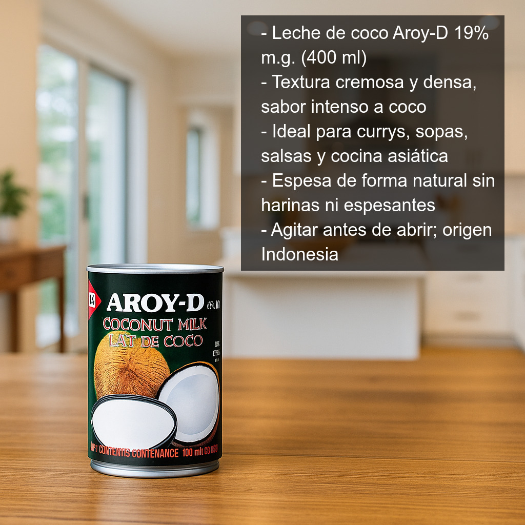 Leche de coco Aroy-D en lata con un 19% de materia grasa (400 ml), ideal si buscas una leche de coco cremosa, densa y con sabor intenso. Este porcentaje de grasa es relativamente alto, lo que aporta una textura más untuosa y un resultado más estable en recetas tanto dulces como saladas.