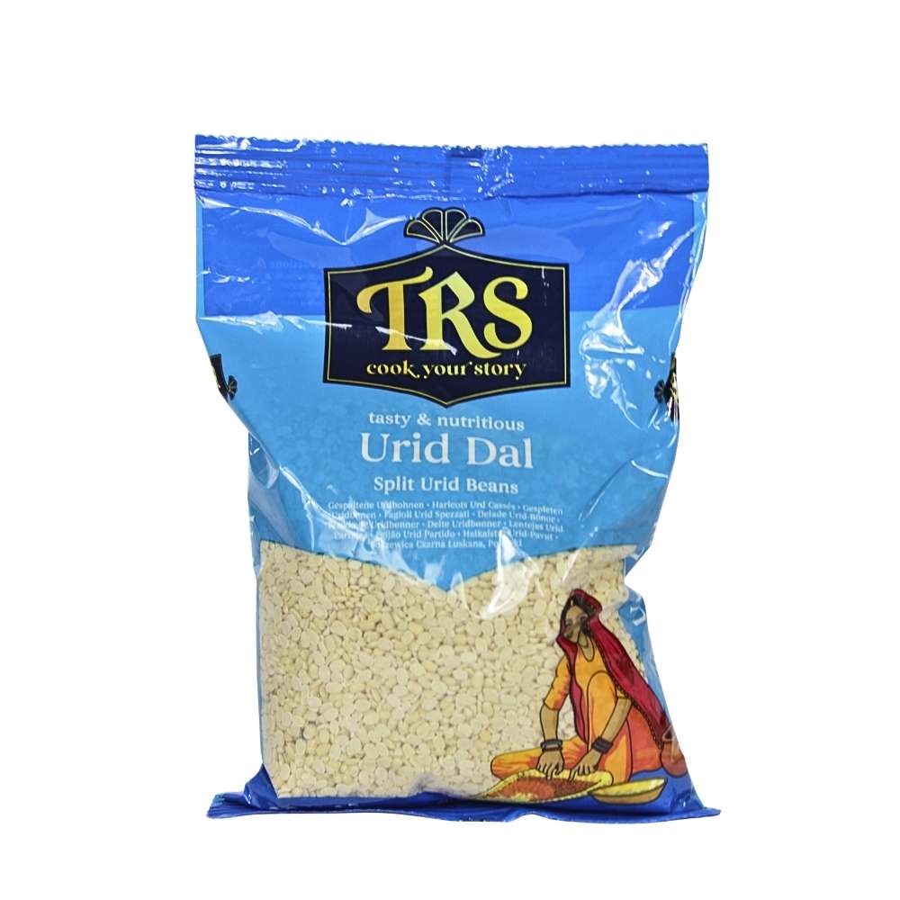 Se presenta en bolsa de 500 g de lentejas urid blancas de la marca TRS.