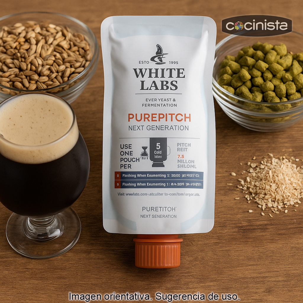 Este formato corresponde al envase White Labs PurePitch® Next Generation, diseñado para ofrecer una alta concentración de células y una mejor viabilidad con el paso del tiempo. Se presenta en una bolsa con tapón de fácil apertura, pensada para un uso cómodo y seguro en elaboraciones de cerveza artesana en casa.