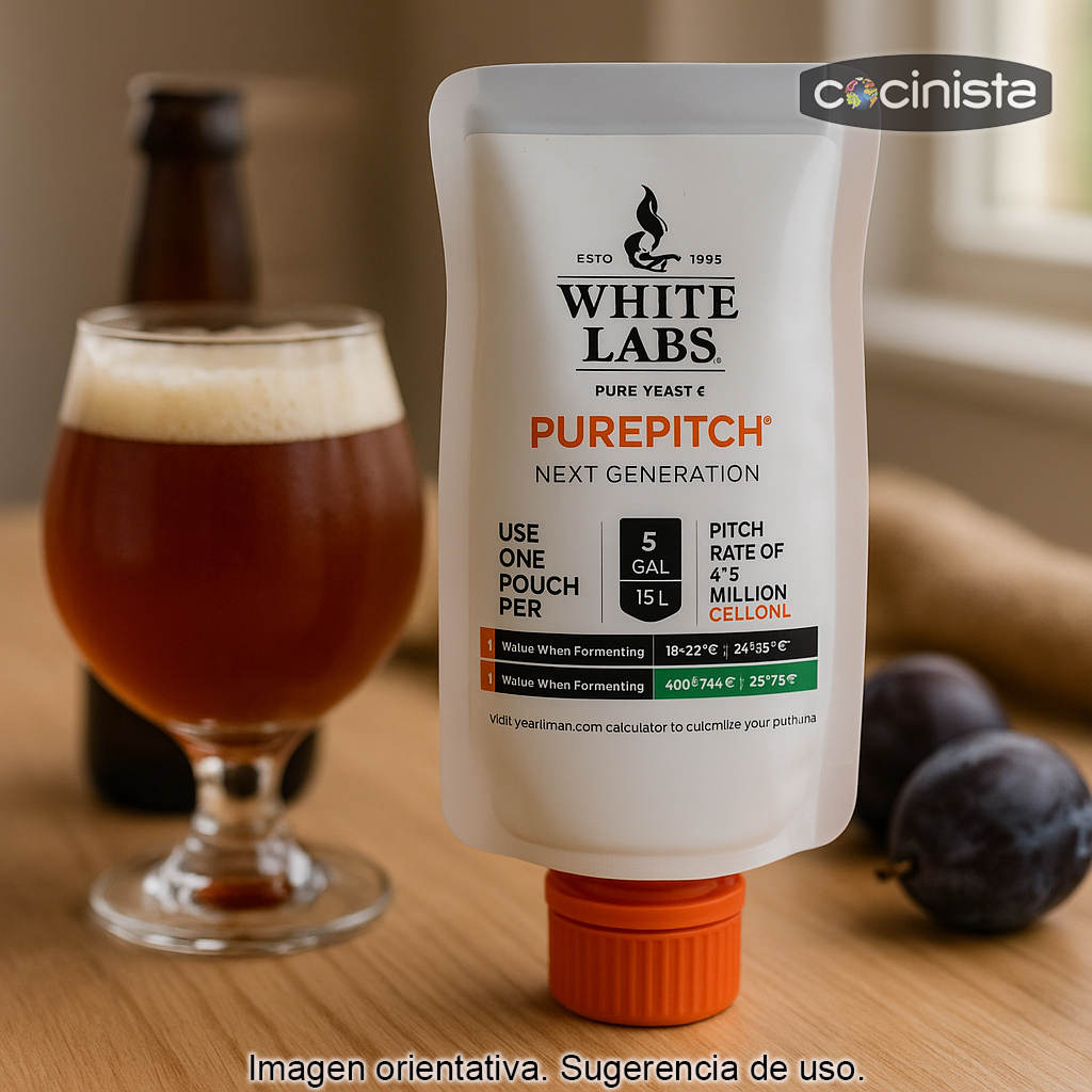 Se trata de la levadura White Labs PurePitch en su envase Next Generation, formulado para mantener una alta viabilidad con el paso del tiempo. Este formato contiene 7,5 millones de células/ml y conserva una mayor proporción de células viables (hasta 94,9% a los 6 meses desde su fabricación, según especificaciones del fabricante). El envase es una bolsa con tapón de fácil apertura.