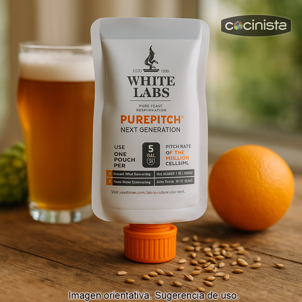 Esta levadura se presenta en el formato White Labs PurePitch con envase Next Generation, diseñado para mantener una alta viabilidad celular con el paso del tiempo. Contiene 7,5 millones de células/ml y conserva una mayor proporción de células viables (hasta 94,9% a los 6 meses desde su fabricación). El envase es una bolsa con tapón de fácil apertura, pensada para un manejo cómodo y seguro.