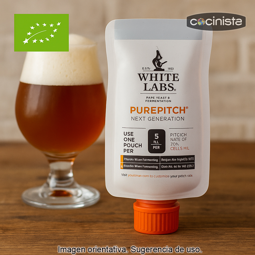 Se trata de la levadura White Labs PurePitch en su envase Next Generation, formulado para mantener una alta viabilidad con el paso del tiempo. Contiene 7,5 millones de células/ml y mantiene una mayor proporción de células viables (aprox. 94,9% a los 6 meses desde su fabricación, según el fabricante). El formato es una bolsa con tapón de fácil apertura.