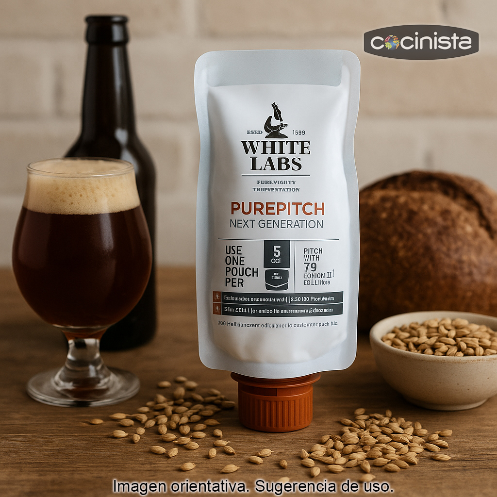 Este producto corresponde a la levadura White Labs PurePitch en su envase Next Generation, formulado para ofrecer una alta concentración de células (7,5 millones de células/ml) y mantener una mayor proporción de viabilidad con el paso del tiempo (94,9% a los 6 meses desde su fabricación). Se presenta en una bolsa con tapón de fácil apertura. Antes de abrir, desinfecta cuidadosamente el exterior del envase para evitar contaminaciones. Al recibirla, consérvala en nevera hasta el momento de uso.