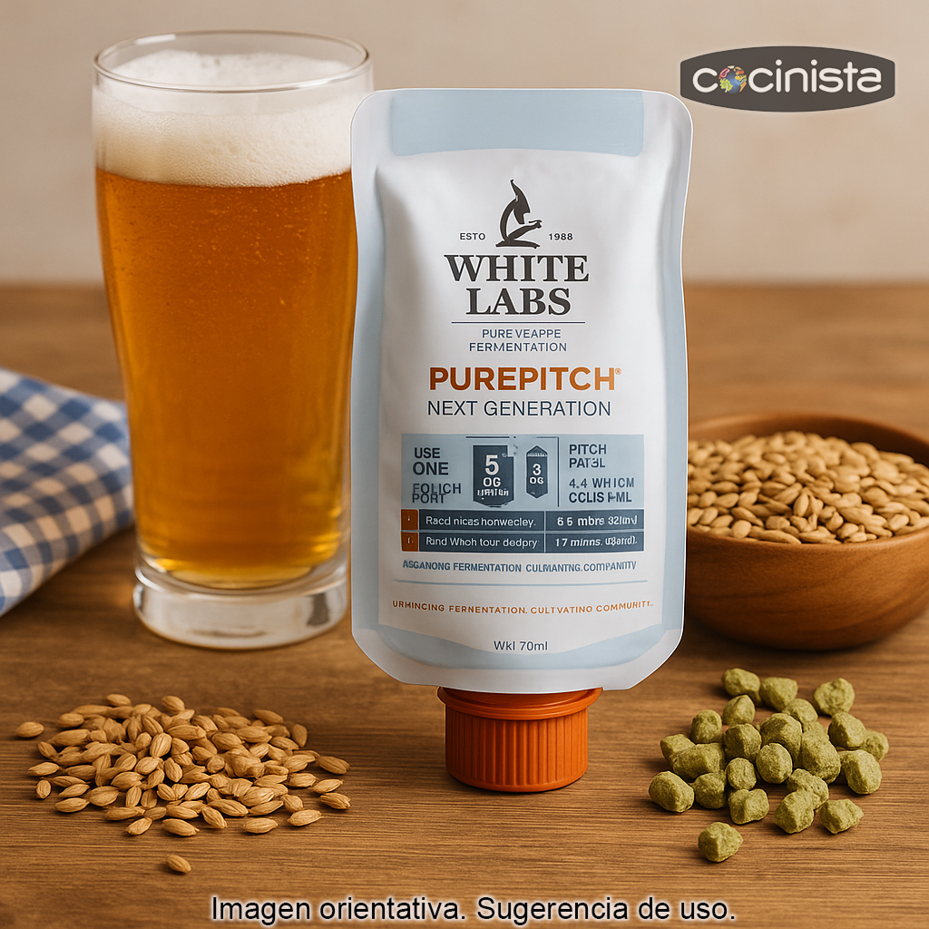 Se trata de la levadura White Labs PurePitch en su envase Next Generation, formulado para ofrecer una alta concentración y viabilidad: 7,5 millones de células/ml y una mayor proporción de células viables con el paso del tiempo (94,9% a los 6 meses desde su fabricación). El formato es una bolsa con tapón de fácil apertura.