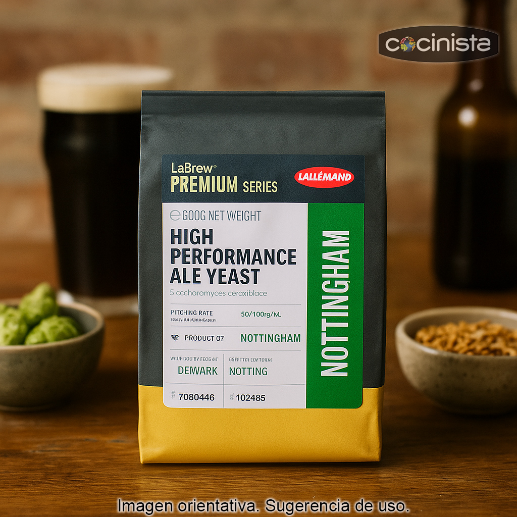 La levadura Nottingham Ale (Lallemand) 500 g es una cepa de estilo inglés reconocida por su fiabilidad, gran rendimiento y versatilidad. Es una elección excelente para cerveceros que buscan una fermentación limpia, rápida y consistente, con un perfil equilibrado que respeta el protagonismo de la malta y el lúpulo.