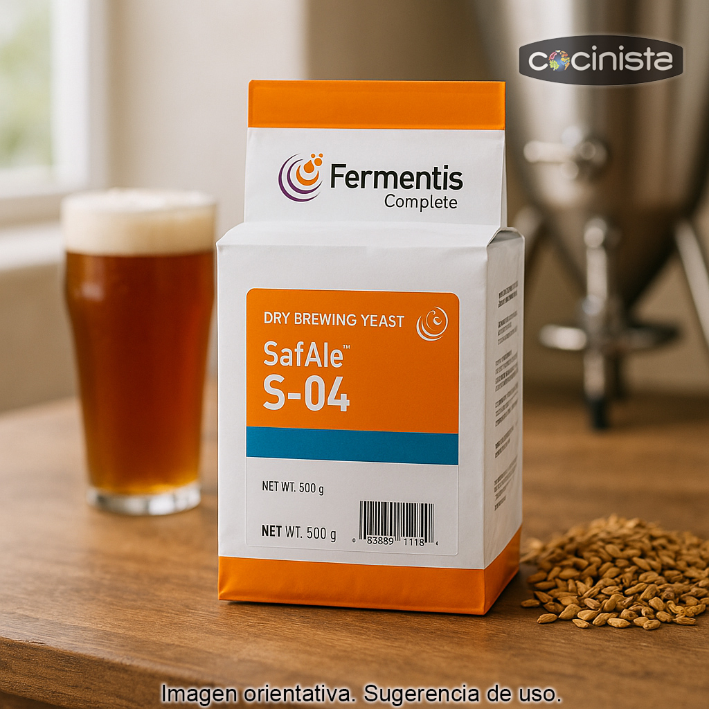 La levadura para cerveza SafAle S-04 (500 g) de Fermentis es una levadura seca activa de cepa Ale inglesa, muy apreciada en elaboración de cerveza artesanal por su fermentación rápida y su alta floculación (forma un sedimento compacto al final), lo que ayuda a obtener una cerveza más limpia y clara con mayor facilidad.