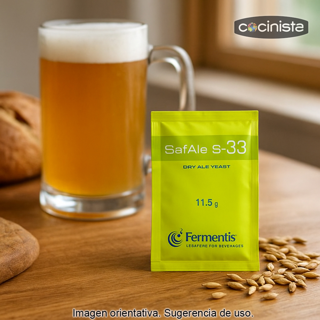 La levadura para cerveza SafAle S-33 (Safbrew S-33) 11,5 g es una levadura seca de fermentación alta (Ale) muy versátil, ideal para cerveceros que buscan una cepa “todo terreno” capaz de adaptarse a una gran variedad de estilos. Aporta un perfil de sabor intenso y redondo, con buena presencia aromática, por lo que resulta especialmente adecuada para cervezas de trigo, cervezas de abadía y cervezas especiales, aunque también funciona muy bien en recetas Ale más sencillas.