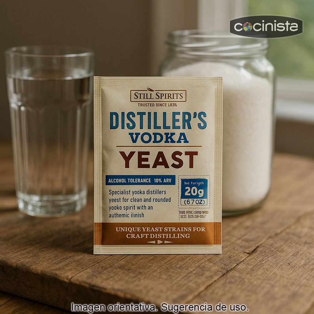 Levadura para destilado (Vodka) 20 g de alta tolerancia al alcohol, especialmente formulada para fermentar bases neutras y obtener un alcohol limpio, suave y redondo, ideal como base para elaborar vodka casero y otros destilados neutros. Esta cepa está pensada para trabajar con mezclas de agua azúcar o agua dextrosa, produciendo un perfil lo más neutro posible, perfecto para destilar y después aromatizar (si lo deseas) o consumir como vodka.