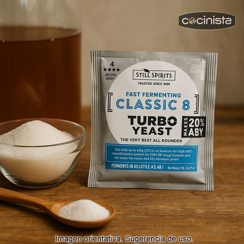 La levadura Classic 8 Turbo está pensada para fermentar mezclas de agua azúcar (u otras bases azucaradas) con el objetivo de obtener un fermentado con alta graduación, adecuado para su posterior destilación. Su formulación ayuda a completar la fermentación de forma eficiente cuando se respetan las proporciones, la temperatura y el tiempo recomendados.