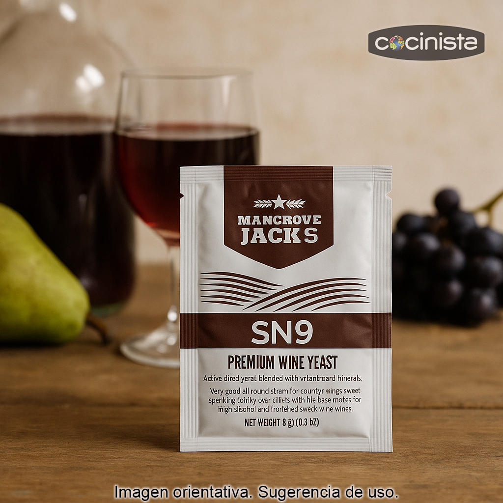 La levadura para vino SN9 (8 g) es una cepa seca seleccionada, muy versátil y “todo terreno”, pensada para obtener fermentaciones seguras y limpias en una amplia variedad de elaboraciones. Es especialmente recomendable para la fermentación de vinos de frutas y mostos poco densos, que suelen carecer de viscosidad y cuerpo, ayudando a conseguir un resultado más equilibrado.