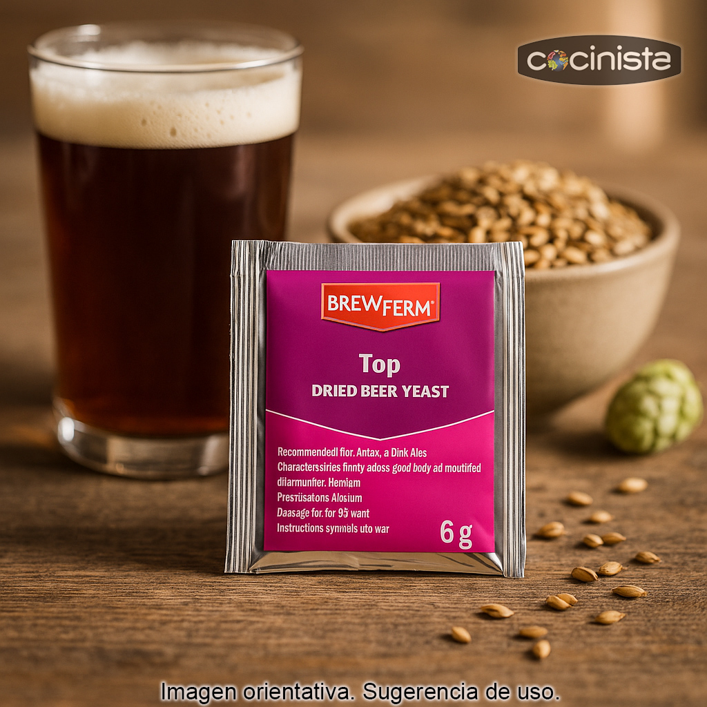 La Levadura Top-6 (6 g) es una levadura seca de fermentación superior (Ale) diseñada para elaborar cervezas de color ámbar y oscuras con un perfil aromático expresivo. Proporciona una fermentación rápida, con bajo azúcar residual y una aportación destacada de ésteres afrutados, ideal para cerveceros que buscan carácter y complejidad en estilos tradicionales y de alta graduación.