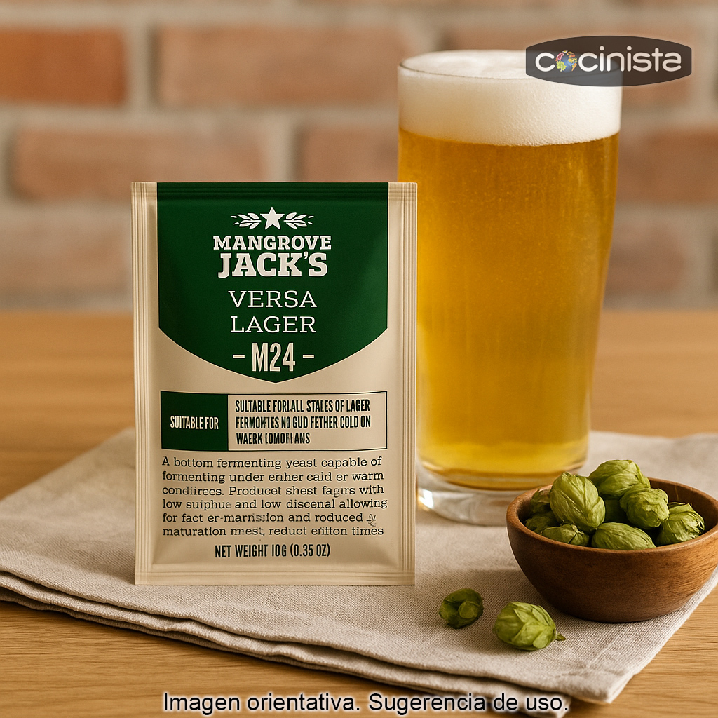 La levadura seca Versa Lager M24 de Mangrove Jack’s es una cepa de fermentación baja (lager) especialmente apreciada por su perfil neutro y limpio y por su gran versatilidad de trabajo. Está diseñada para fermentar correctamente en un amplio rango de temperaturas, lo que permite elaborar lagers con mayor facilidad, incluso cuando no se dispone de un control de frío muy estricto, y también acelerar fermentaciones en condiciones más cálidas sin perder limpieza.