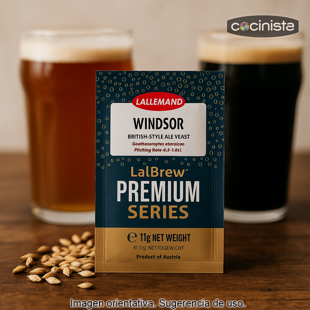 La levadura Windsor de Lallemand (sobre de 11 g) es una levadura seca de fermentación alta procedente de una cepa genuinamente británica, muy apreciada por su capacidad para generar una rica expresión de ésteres (aromas y sabores afrutados) que se perciben claramente tanto en nariz como en boca. Las cervezas elaboradas con Windsor suelen resultar robustas, redondas y afrutadas, con un perfil clásico de ale inglesa.
