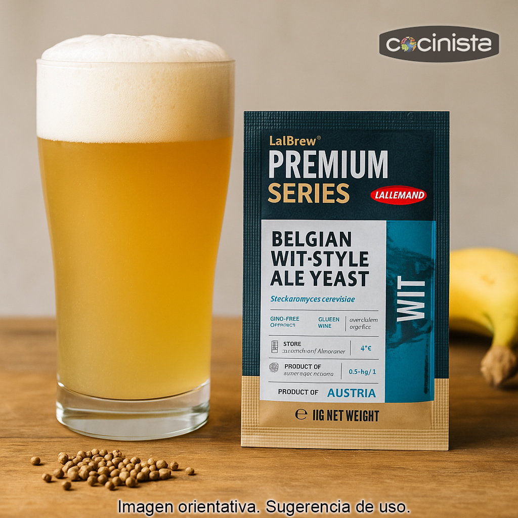 La levadura Wit de Lallemand (sobre de 11 g) es una levadura seca especialmente indicada para elaborar cervezas de trigo de inspiración belga y alemana. Fermenta con un perfil relativamente neutro, pero aporta los matices clásicos del estilo: ésteres afrutados (recuerdos a plátano) y un toque especiado muy característico en cervezas tipo wheat.