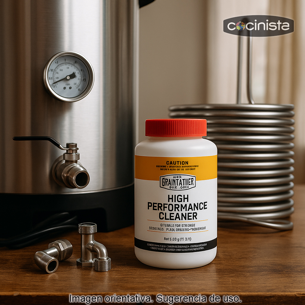 El limpiador de alto rendimiento (500 g) está especialmente formulado para la limpieza en profundidad de equipos de elaboración como Grainfather y sistemas similares (ollas eléctricas, calderas de macerado/hervido y accesorios). Su acción desincrustante ayuda a eliminar restos de proteínas, suciedad adherida y residuos difíciles sin necesidad de frotar intensamente, facilitando un mantenimiento rápido y eficaz tras cada elaboración.